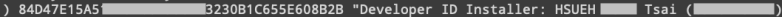 在終端機上輸入 security find-identity -v 找到用於簽署 Installer 的憑證。前面那一串數字加英文是憑證的識別資訊,後面則是憑證名稱。將後面的憑證名稱複製下來。